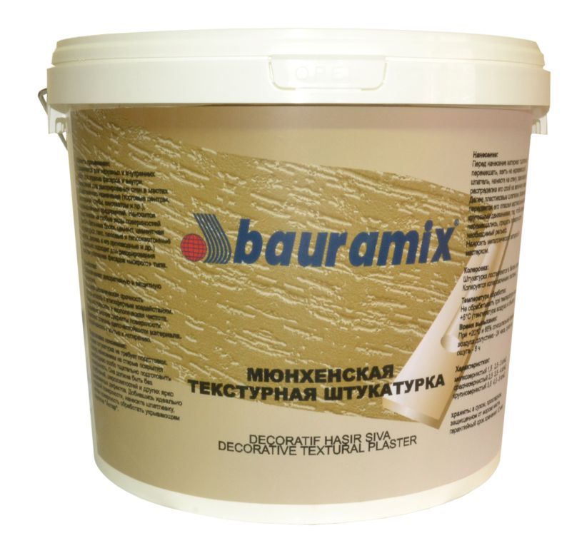 Акриловая мюнхенская штукатурка от компании Bauramix.kz это уже готовы раствор ведрах, по 25 кг, готовый для нанесения, как на фасад так и внутри дома.