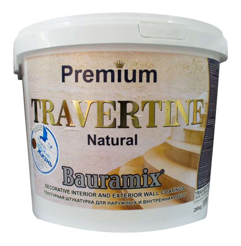 Декоративная штукатурка на основе натурального Травертина, позволяющая создавать имитацию природного камня –травертин и имеет два натуральных цвета(слоновая кость,цвет натурального травертина). Покрытие препятствует образованию плесени, не впитывает в себя запахи, обладает повышенной износостойкостью долговечностью, легко поддается уходу и реставрации.